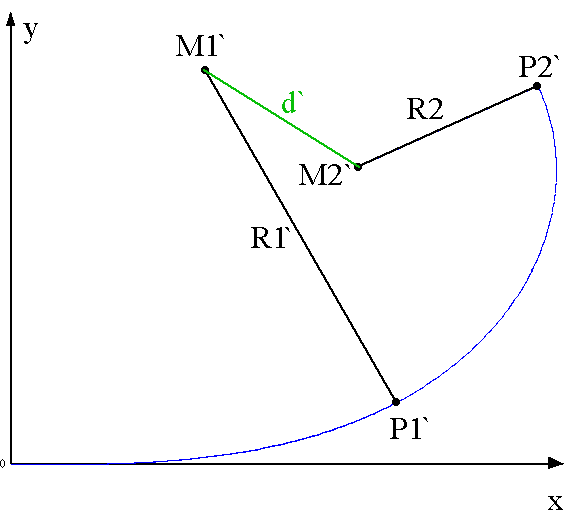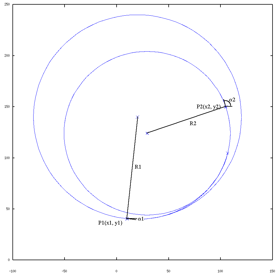 L1 = R1 * A2Anhand der berechneten Längen können die Koordinaten ermittelt werden. Mit Hilfe der Richtungswinkel und der Radien in den Punkten P1 und P2 berechnet man die Mittelpunkte M1 und M2.