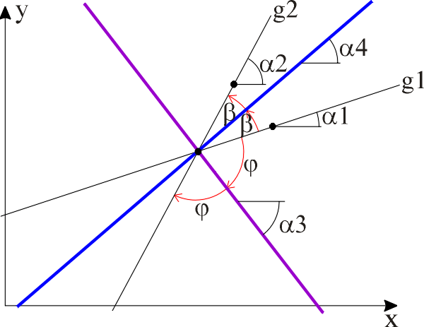 Eine Gerade ist durch zwei nicht identische Punkte P1 und P2 eindeutig bestimmt. Da jedoch Geraden in meinem Programm in einer Punkt-Winkel-Form verwaltet werden, ist die Berechnung des Richtungswinkels der Gerade nötig.
