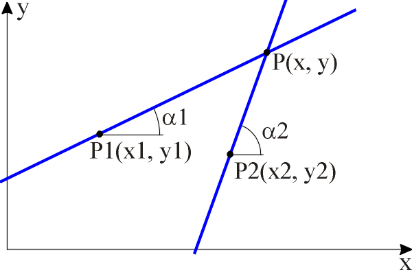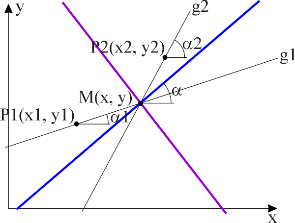P1(x1, y1) Koordinaten eines Punktes auf der Gerade g1 a1 Richtungswinkel der Gerade g1 P2(x2, y2) Koordinaten eines Punktes auf der Gerade g2 a2 Richtungswinkel der Gerade g2