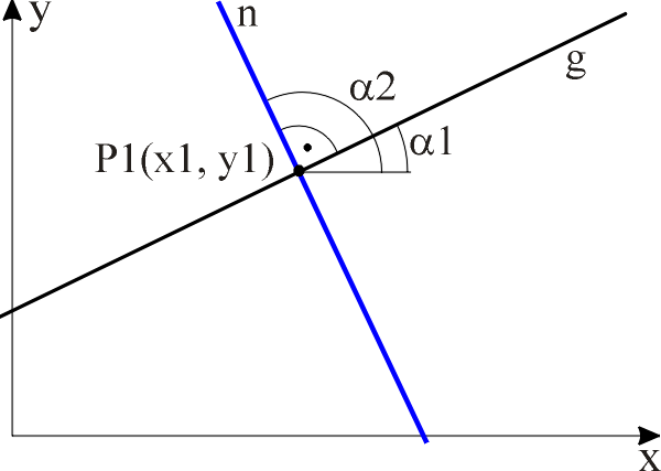 Die Berechnung einer Normalen ist ohne großen Aufwand möglich. Für den Punkt P können die Koordinaten des Punktes P1 verwendet werden. Der Winkel a2 ergibt sich durch Addition von p/2 zum Richtungswinkel a1